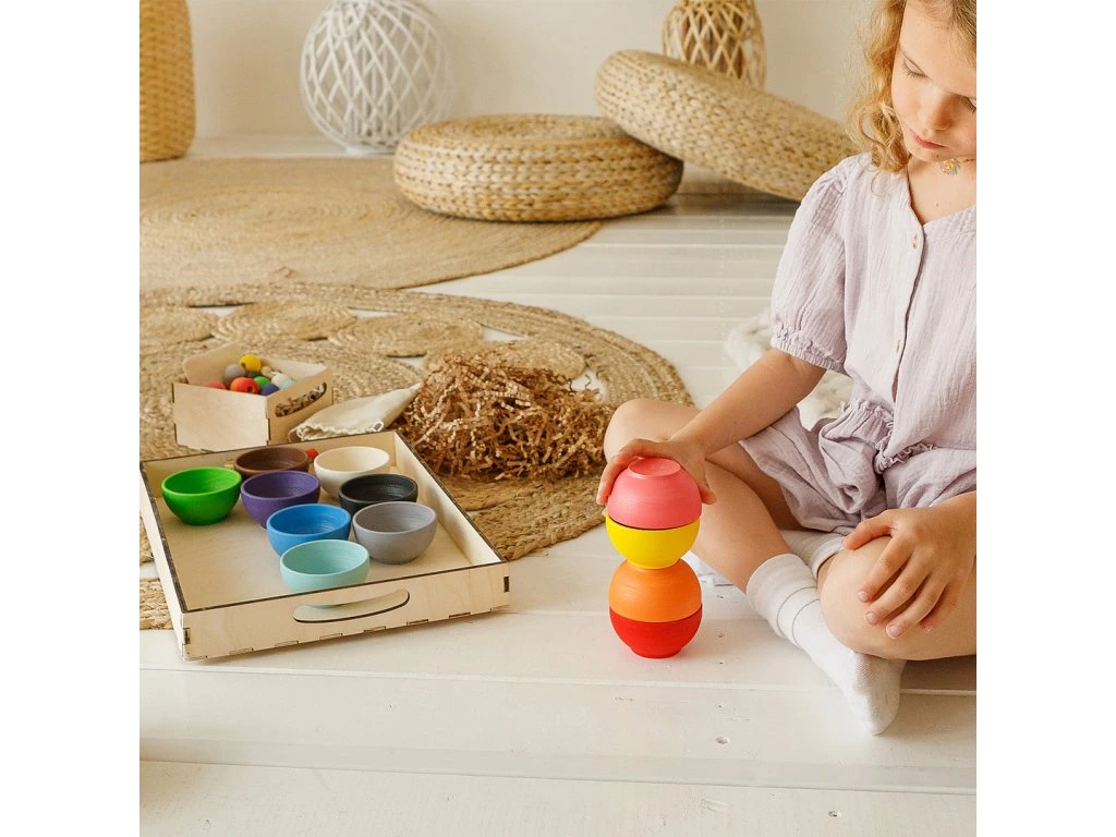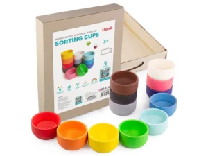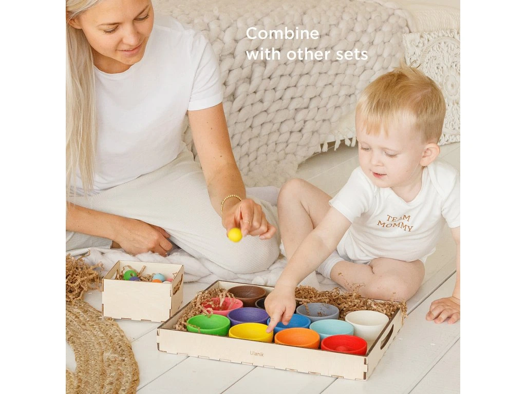 Sada 12 barevných dřevěných mističek od Ulanik je krásným montessori pomocníkem pro třídění, ukládání a smyslové hraní. Každý kelímek je vyroben z lipového dřeva a ošetřen přírodním voskem BIOFA, který je certifikovaný pro dětské hračky a bezpečný i pro batolata. Kelímky lze využít samostatně nebo jako doplněk k dalším Ulanik sadám – skvěle ladí s panáčky, kuličkami nebo stavebními aktivitami. Díky jednoduchému tvaru se dobře drží, jsou příjemné na dotek a lákají děti k otevřenému objevování.