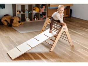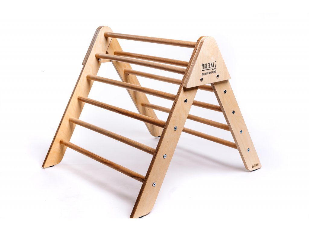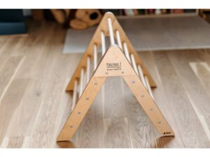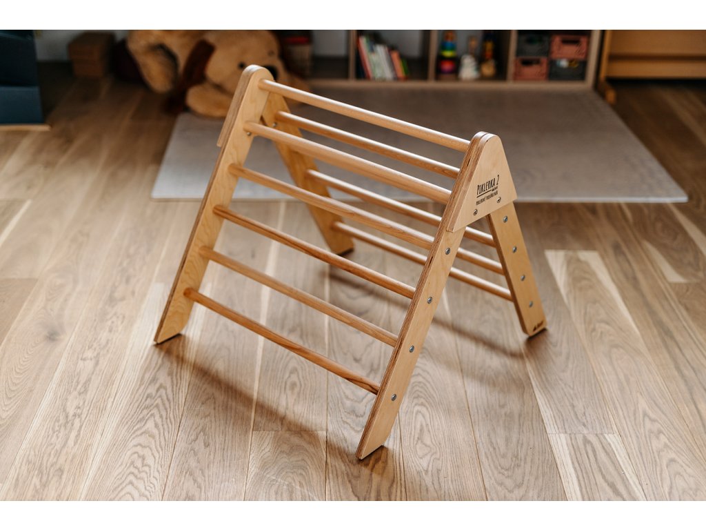 Tento dřevěný trojúhelník (tzv. Pikler triangle) je inspirován pediatričkou Emmi Pikler a Montessori přístupy. S jeho pomocí mohou děti volně objevovat pohyb, zkoušet lezení, podlézání, nebo stavět vlastní překážkové dráhy.
