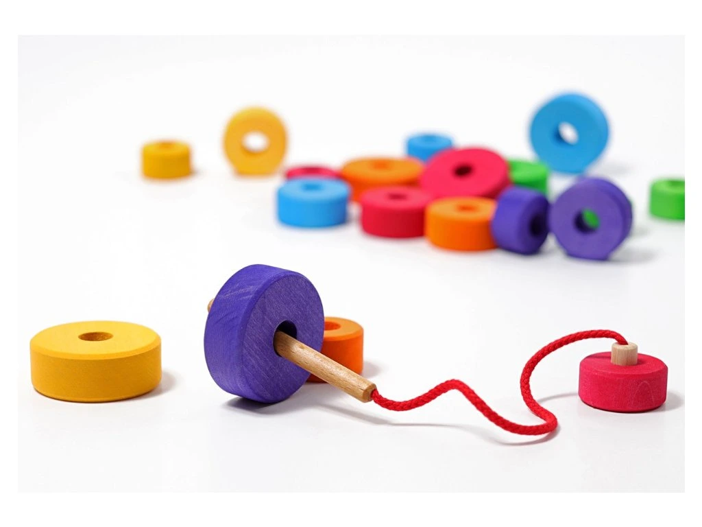 Tato dřevěná hračka představuje první krok do světa navlékání – sada obsahuje 19 dílků (kotoučky) a